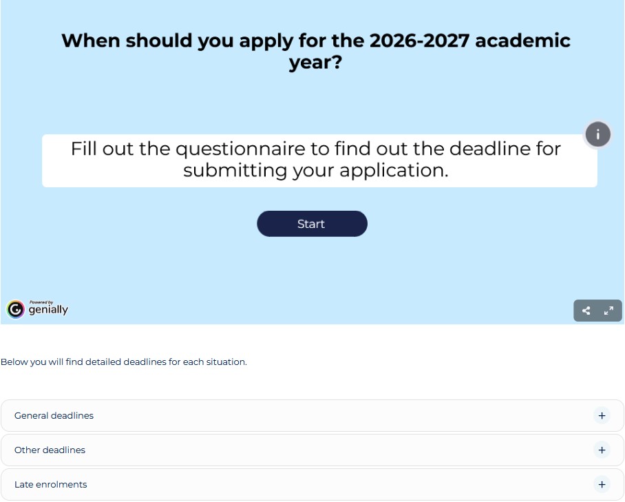 Fill out the following questionnaire to find out the deadline for submitting your application or consult the deadlines for more information: