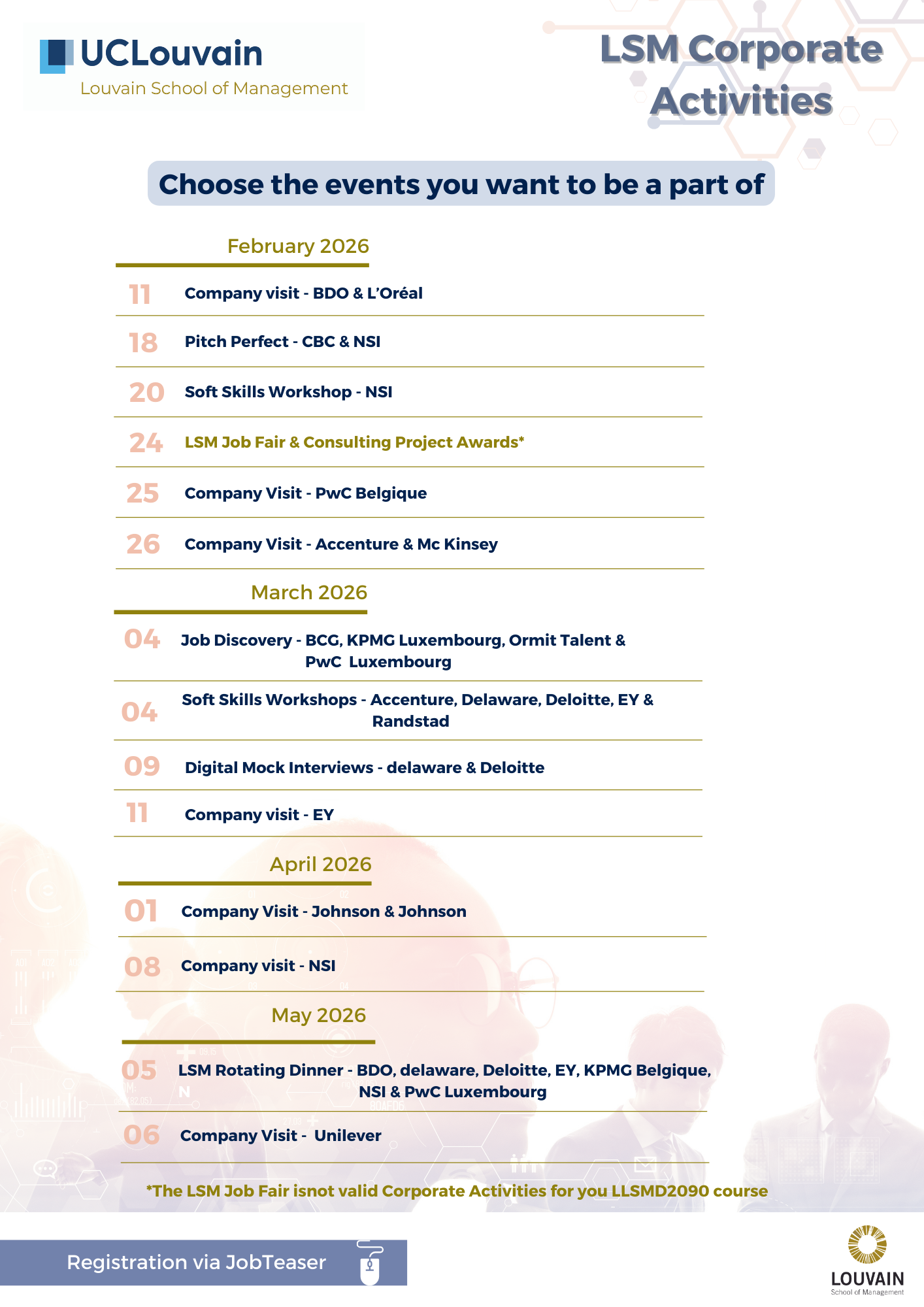 Please find the calendar for next semester's activities below. Don't forget that all students must register to the activities on the Career Center!