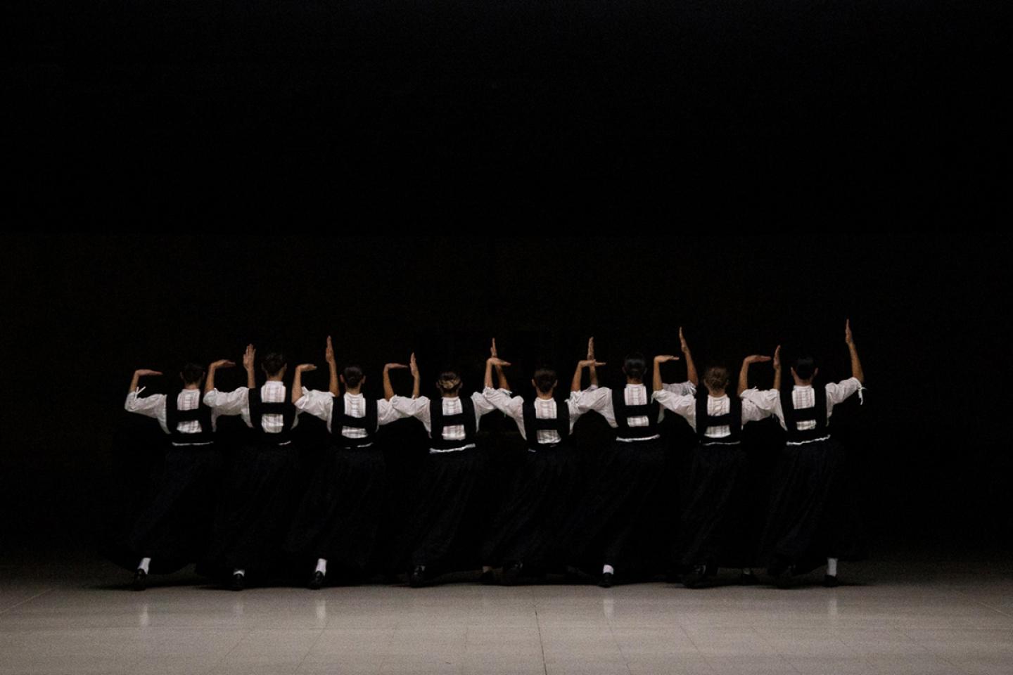 Lancées à vive allure sur le plateau, neuf femmes dansent, à perdre haleine, l’histoire d’une humanité prise dans son propre tourbillon. Un monde où les corps s’emballent en noir et blanc sous des chignons serrés et d’austères jupons. Que les femmes évoquent la sainte ou l’ingénue, la mariée immaculée ou la sorcière poings levés, elles font corps et cris. Un cri puissant d’êtres humains qui veulent continuer à clamer qu’ils sont vivants.