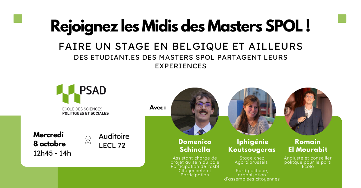 les "Midis des masters" SPOL c'est un rendez-vous que nous aurons quelques fois sur le temps de midi (12h45-14h) pour discuter de questions liées à votre formation et de curiosités ou intérêts que vous pourriez avoir – liés à votre formation.
