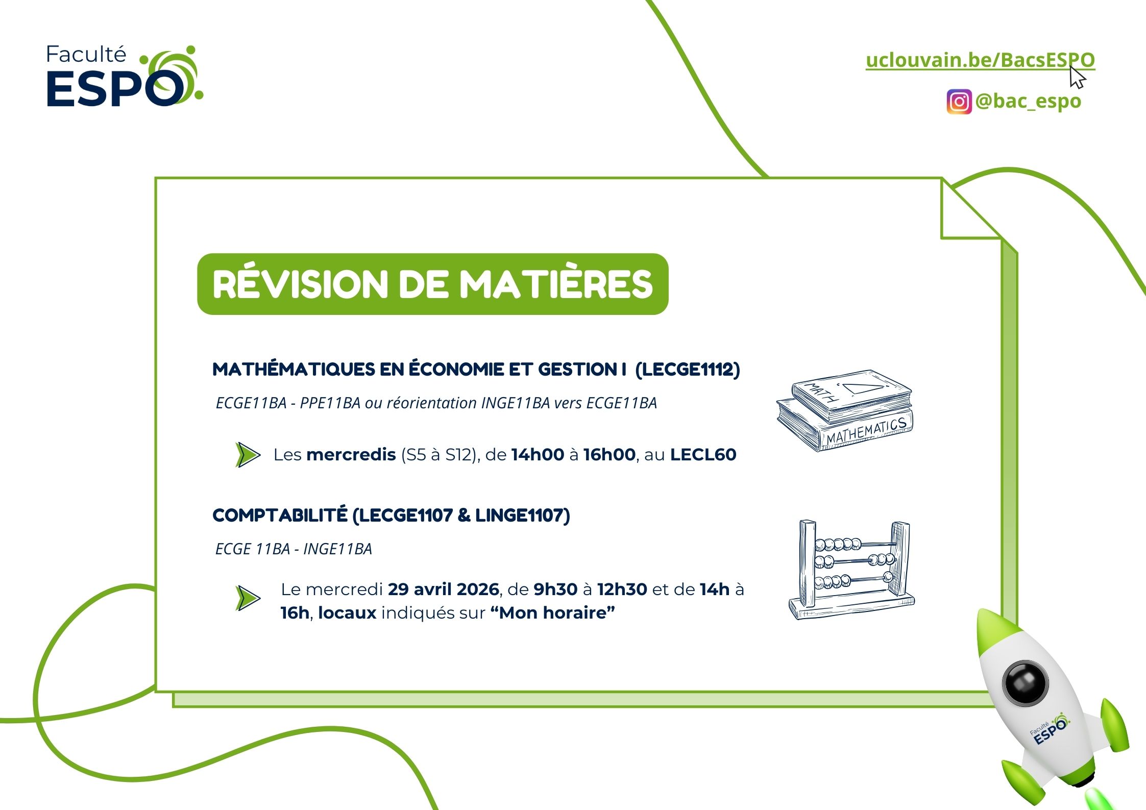 Tu es en ECGE11BA, PPE11BA ou en réorientation INGE11BA vers ECGE11BA et tu as besoin d’un coup de pouce avec ton cours de mathématiques en économie et gestion ? Des séances de révisions sont organisées spécialement pour t'aider à y remédier !