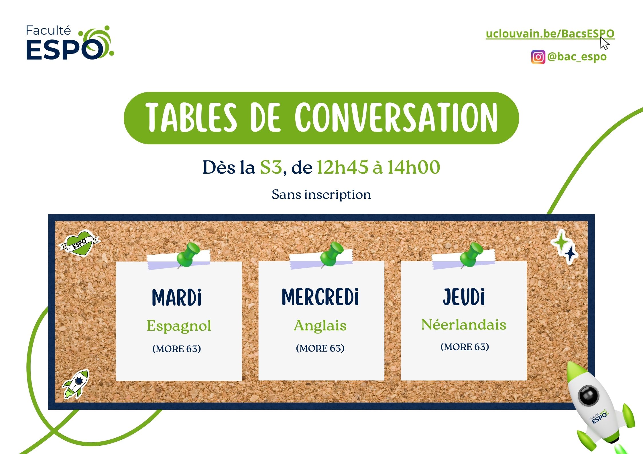 Participe aux tables de conversation en anglais, néerlandais ou espagnol organisées sur le temps de midi (12h45 - 14h00) dès la S3 (et jusqu'en S10), en faculté ESPO !