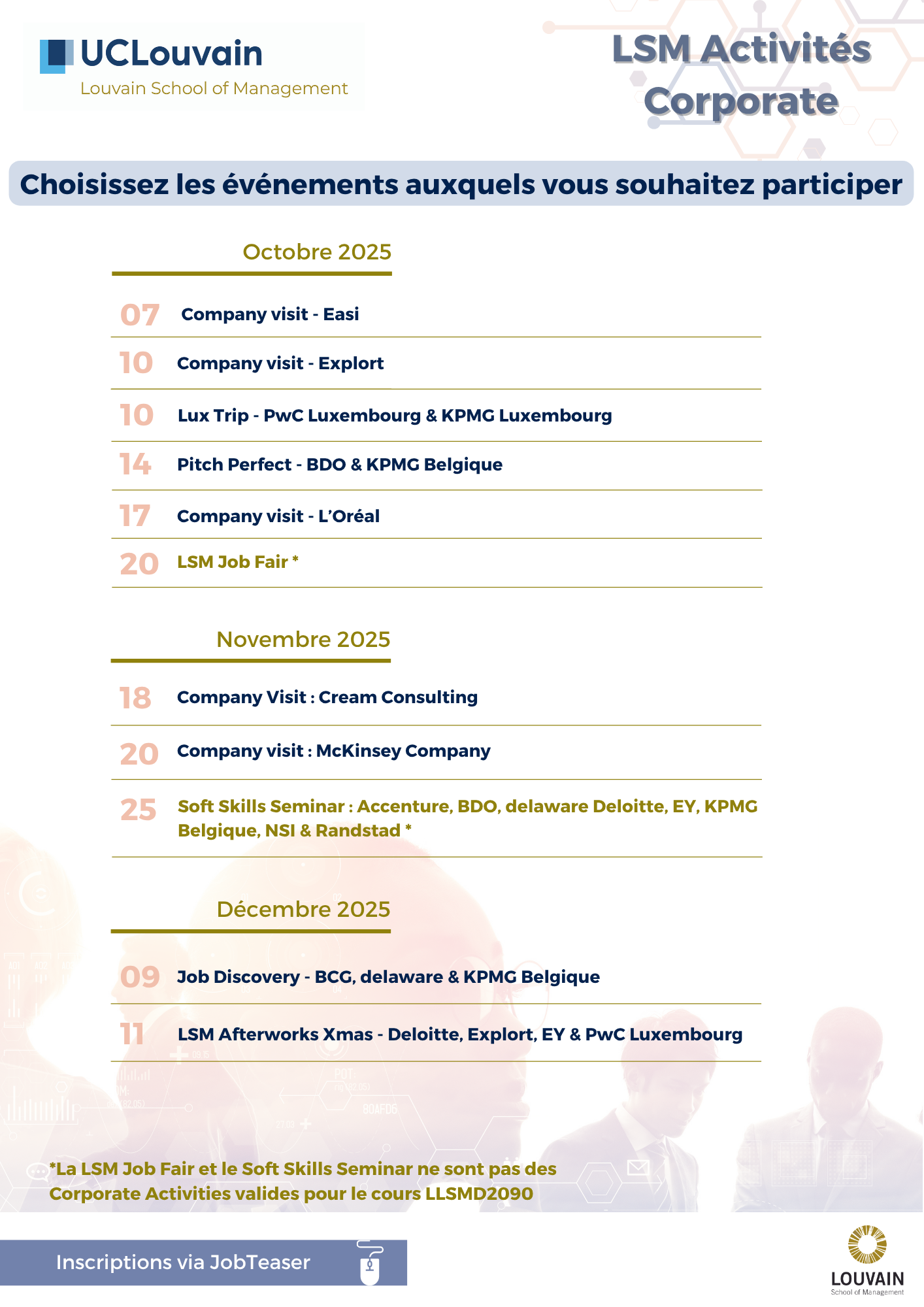 Dès leur première année, dans le cadre du cours LLSMD2091-LLSMD2090 – Seminar on Relational and Managerial Competencies, chaque étudiant·e participe à une activité entreprise afin de se rapprocher du marché de l’emploi et est invité à développer son potentiel en participant à une activité Soft Skills.