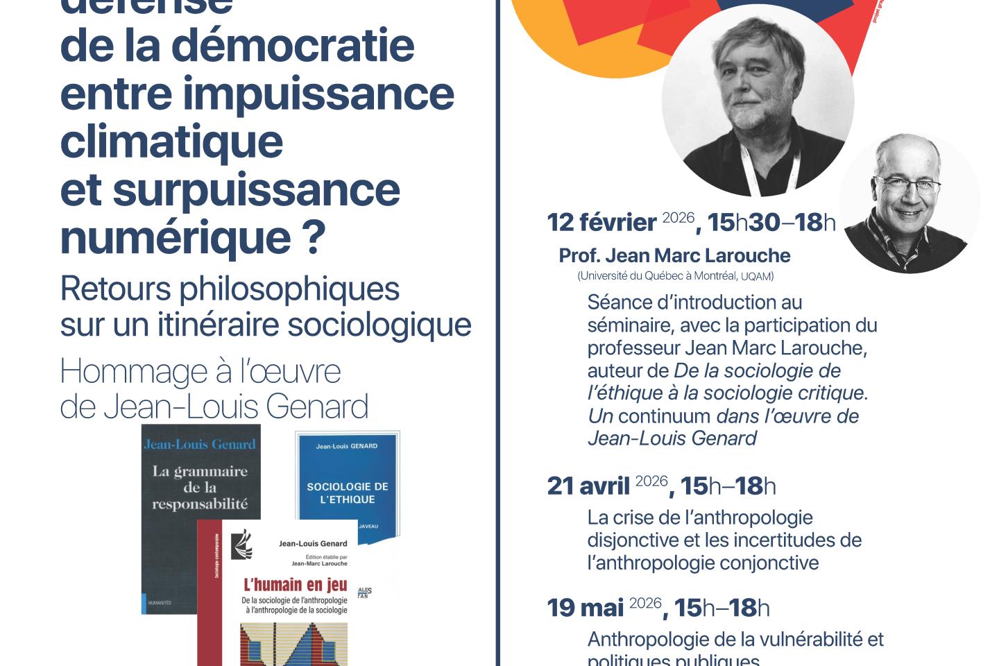 › 12 février 2026, 15h30-18h : séance d'introduction au séminaire, avec le Prof. Jean Marc Larouche (Université du Quebec à Montreal, UQAM), auteur de De la sociologie de l'éthique à la sociologie critique. Un continuum dans l'oeuvre de Jean-Louis Genard.