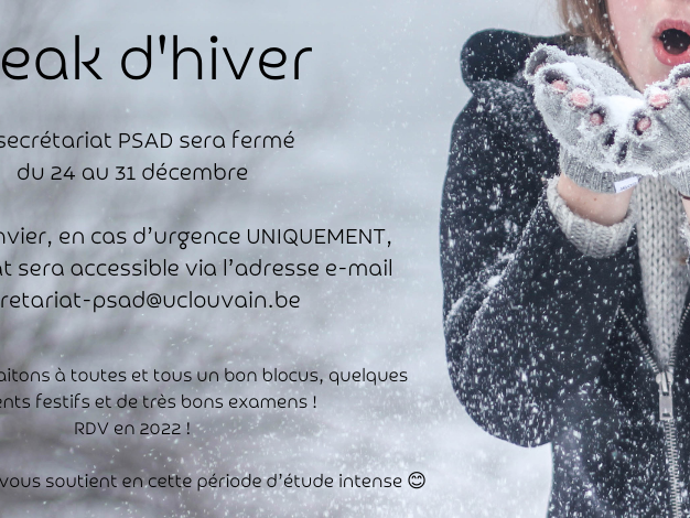 Du 3 au 7 janvier, en cas d’urgence UNIQUEMENT, le secrétariat sera accessible via l’adresse e-mail secretariat-psad@uclouvain.be.