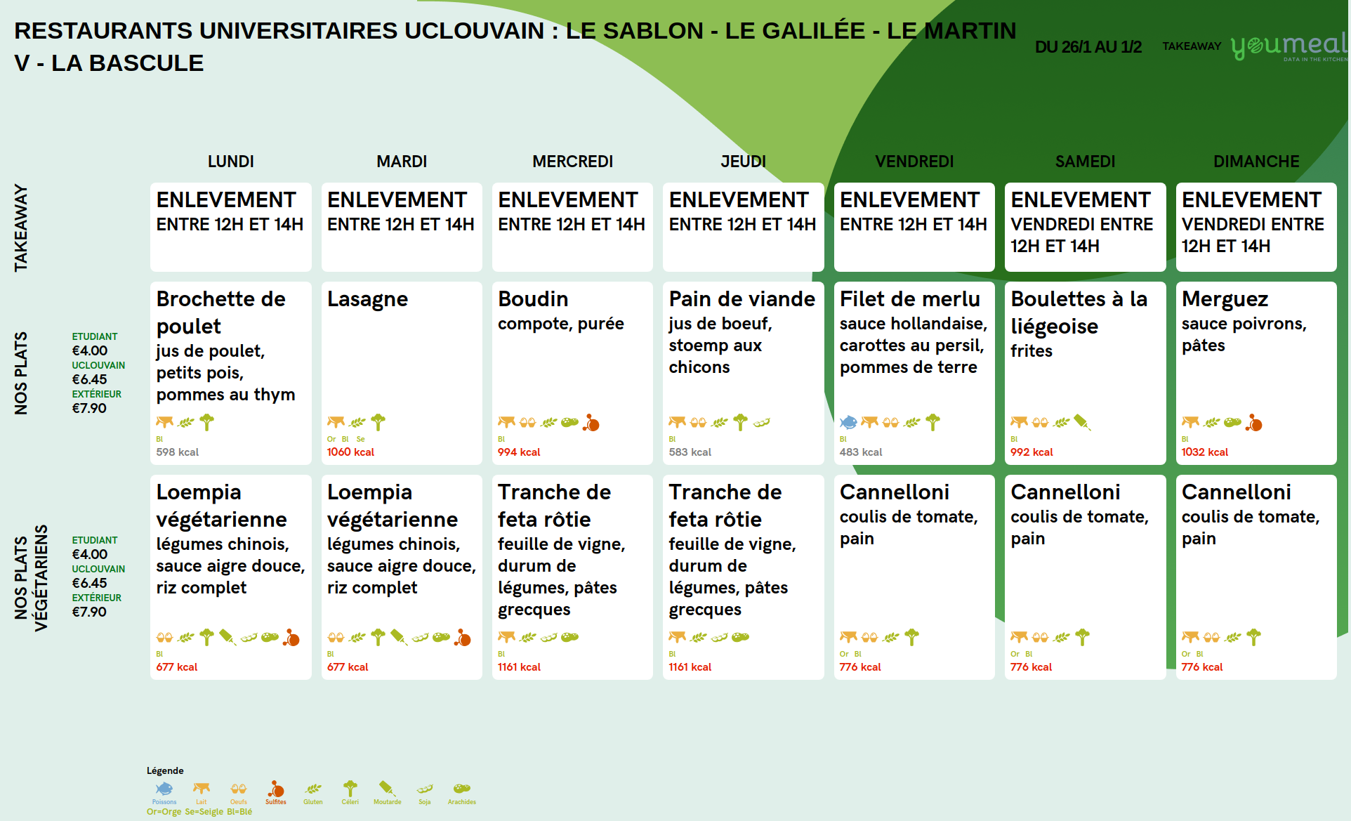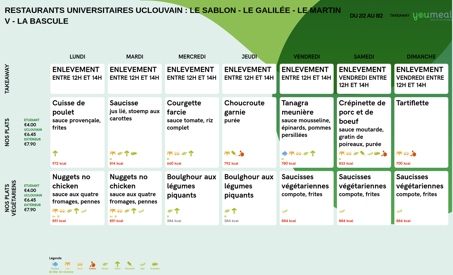 Vous trouverez le menu en bas de cette page ou sur notre page Facebook https://www.facebook.com/restaurants.universitaires.uclouvain/.