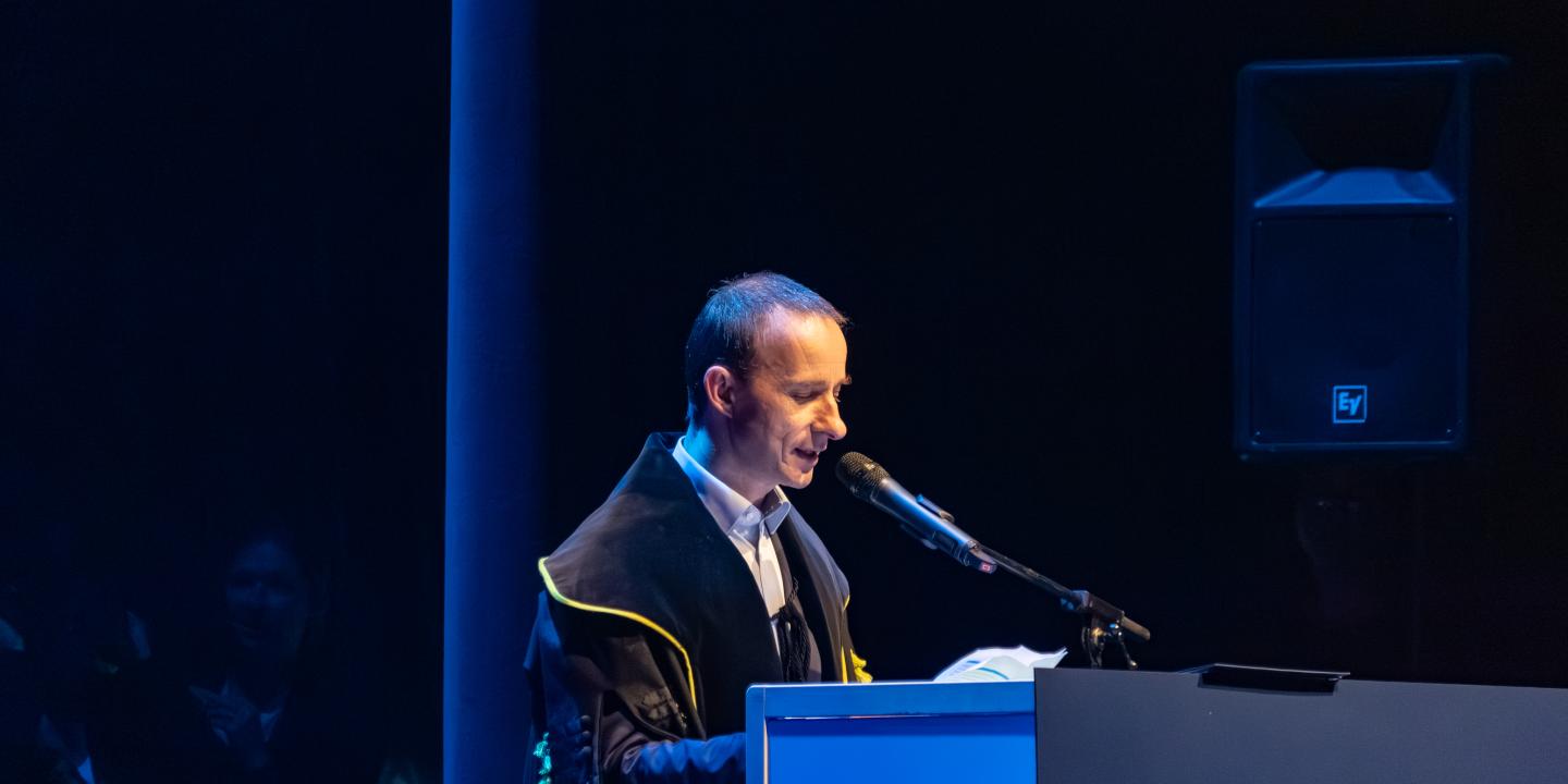 Le Prof. Pierre Baudewyns, doyen de la faculté ESPO, et le Prof. Matthieu de Nanteuil, doyen de la faculté LSM, ont ensuite pris la parole pour féliciter chaleureusement la promotion. Tous deux ont salué la qualité des parcours et rappelé l’importance de la coopération, de la réflexion critique et de la confiance en soi dans les carrières à venir.