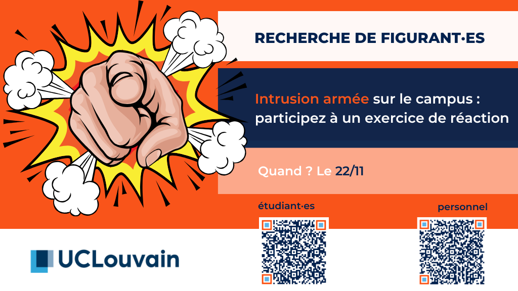 Rassurez-vous, la probabilité que ce type d’attaque se produise est extrêmement faible et il n'y a aucune menace particulière envers les universités actuellement. Mais pour pouvoir réagir rapidement, l’UCLouvain a mis en place des procédures d’intervention en collaboration avec la police. Pour tester leur efficacité, deux exercices « en live » seront organisés sur le campus Woluwé le 22 novembre . Nous recherchons 140 figurant·es (membres du personnel et étudiant·es) pour y jouer leur propre rôle.